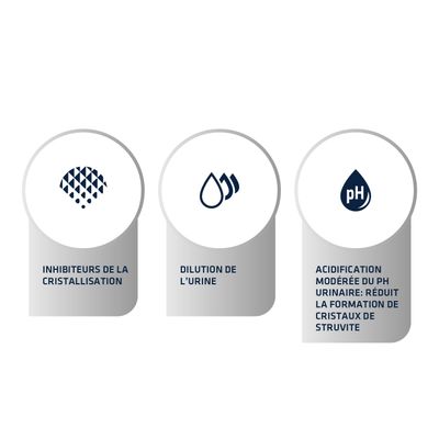 - pH urinaire optimal : propriétés acidifiantes, pour créer un milieu défavorable à la formation de calculs de struvite