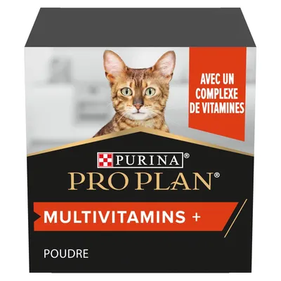 PRO PLAN Multivitamins+ Supplement peut augmenter la vitalité et favoriser la santé de la peau et du pelage de votre petit félin.