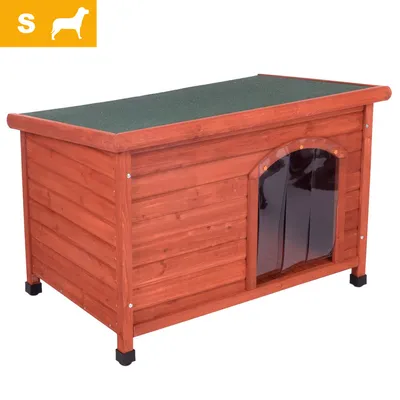 Niche pour petit chien, à toit plat rabattable, en bois huilé. Protège votre chien du froid et de l'humidité du sol, bonne aération, résistante aux intempéries. Facile à monter et à nettoyer.